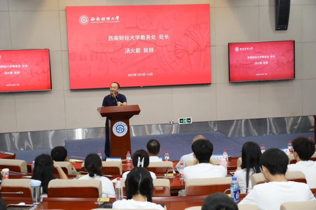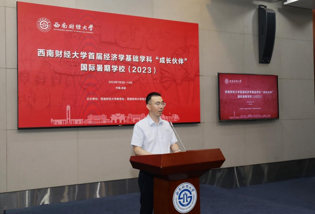 西南财经大学经济学院于2023年7月3日举行备受期待的“成长伙伴”国际暑期学校开幕式,标志着一场为期两周的学术盛会正式启动。“成长伙伴”国际暑期学校由教务处和经济学院共同举办。本次活动的目标是培养经济学领域的拔尖创新人才,为优秀学子提供与国内外顶尖学者和同龄学子深入交流的平台。开幕式在弘远楼101举行,教务处处长汤火箭、经济学院党委书记兰敏、经济学院副院长韩文龙、经济系主任李标、数字经济学主任吴应军、经济学拔尖学生培养基地主任姚常成、经济学院姚凯、李桦林、方小书、黄沙沙、王韵雯等老师,以及35位入营学员参加了这场盛会。