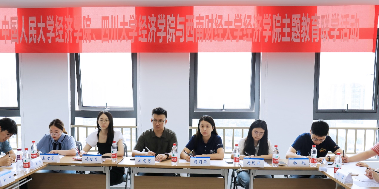 随后,三校师生在诚正楼1542会议室就主题教育和党建经验等话题进行了座谈交流。在座谈会上,韩文龙汇报了我院开展主题教育的主要做法和取得的阶段性成果;梁剑介绍了四川大学经济学院传承红色文化及革命传统的主要做法和学生支部建设的主要经验;蒋莉薇介绍了中国人民大学经济学院学生党支部开展主题教育和创建全国研究生样板支部的有益经验等。三校学生党支部书记和党员也围绕样板支部创建、党员管理和党支部建设等进行了深入交流。