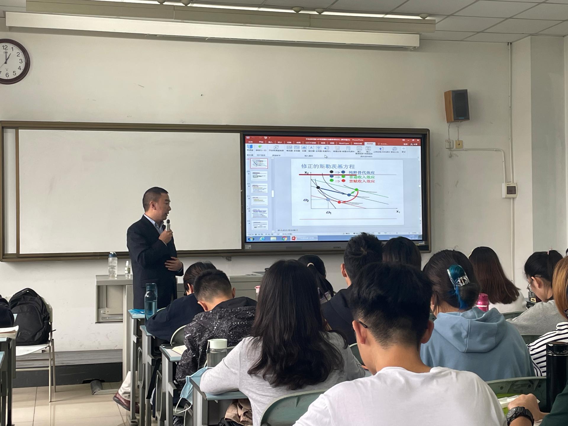 本次《中级微观经济学》课程由全国微课比赛优秀奖和四川省微课比赛一等奖、学校优秀教师、学生“我心目中的好老师”袁正教授主讲。袁正教授围绕中级微观经济学的基本原理--斯勒茨基方程的分解计算的讲解,并结合由他本人主编的《微观经济学课程思政案例集》的案例分析,深入浅出、润物无声地将思政元素融入到专业知识的讲解之中,将价值观引导融入到知识传授和能力培养之中,达到了课程思政教学的效果。聆听的同学和青年教师深受启发。