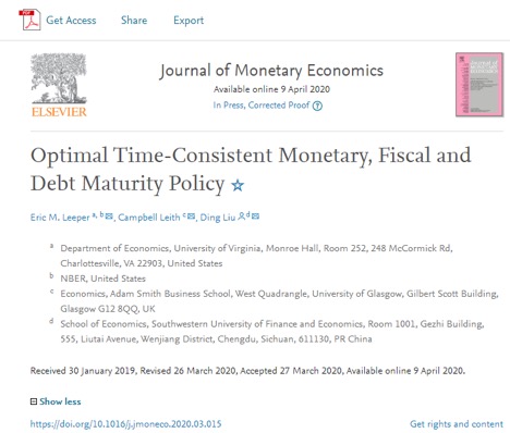 日前,我校经济学院西方经济学研究所刘定副教授(通讯作者)与美国弗吉尼亚大学的Eric Leeper教授和英国格拉斯哥大学的Campbell Leith教授合作的论文《Optimal Time-Consistent Monetary, Fiscal and Debt Maturity Policy》在线发表在宏观经济学和货币金融学国际顶级期刊《Journal of Monetary Economics》上。