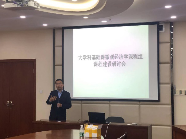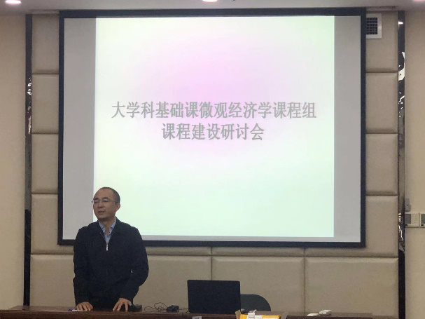 经济学院西方经济学研究所所长袁正教授首先就大学科基础课微观经济学课程组课程建设发表讲话。袁老师从统一考核、课程思政、慕课建设、教材编写以及日常工作五个方面提出要求和建议。