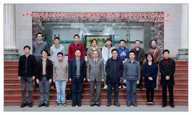 2019年11月9日下午,由西南财经大学全国中国特色社会主义政治经济学研究中心、西南财经大学经济学院政治经济学研究所、西南财经大学马克思主义经济学研究院联合举办的“新中国70年政治经济学学科发展与范式创新——暨西部地区高校政治经济学中青年骨干教师座谈会”在西南财经大学经济学院成功举行,来自四川大学、西南大学、重庆工商大学、贵州财经大学以及西南财经大学等校的专家参加了会议并作了学术报告。