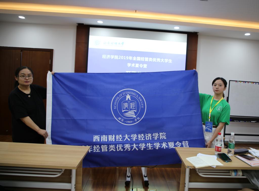 2019年7月11日早晨九点,经济学院2019年全国经管类优秀大学生学术夏令营正式开营。邹红副院长致欢迎词,她热烈欢迎了在场的61位优秀学子前来参加此次夏令营,并从历史沿革、师资背景、学科设置、学术实力、硕博情况等多个方面,向营员们展现了经济学院的独特优势和魅力。致完欢迎词,邹红副院长将此次营旗授予了营长-刘丽娇同学。