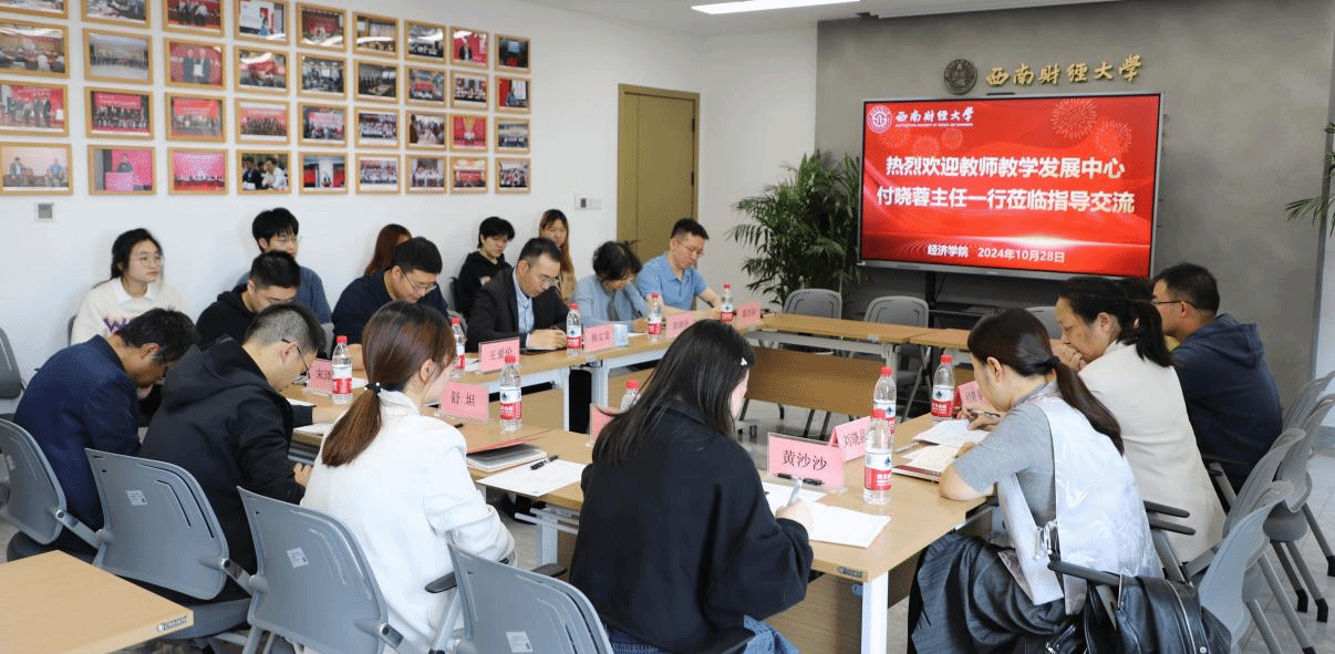 2024年10月28日,教师教学发展中心主任付晓蓉及中心各科室负责人一行四人莅临经济学院,就教师队伍建设、教学竞赛培训、教学质量提升及学生学业指导等内容进行了深入研讨与交流。经济学院副院长韩文龙教授、系所主任代表、教师代表、辅导员、本科教学秘书和学生代表参加了研讨座谈会。韩文龙副院长主持本次会议。