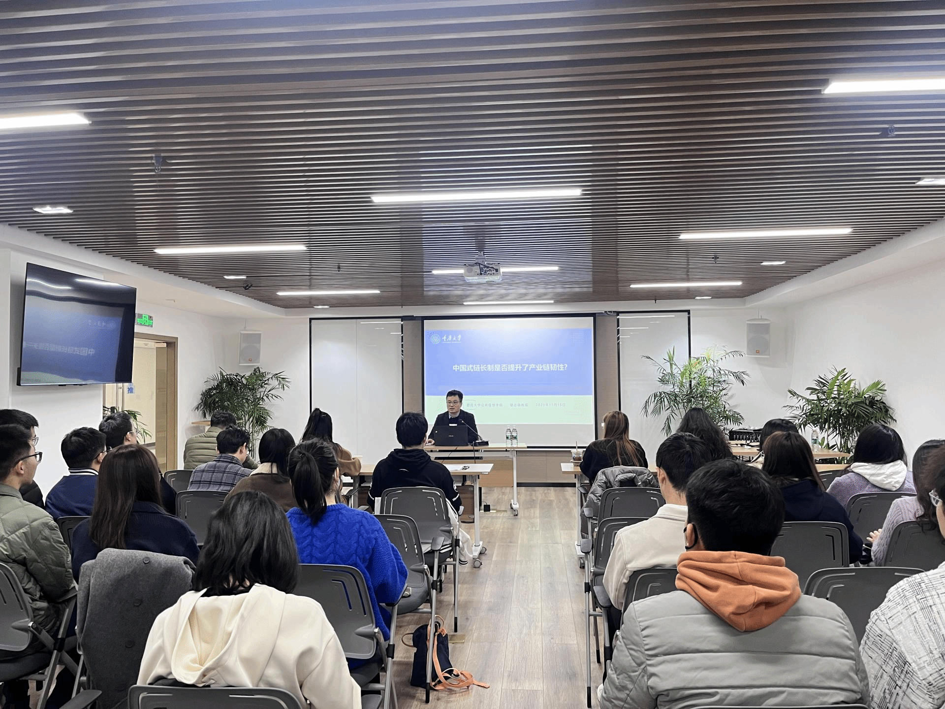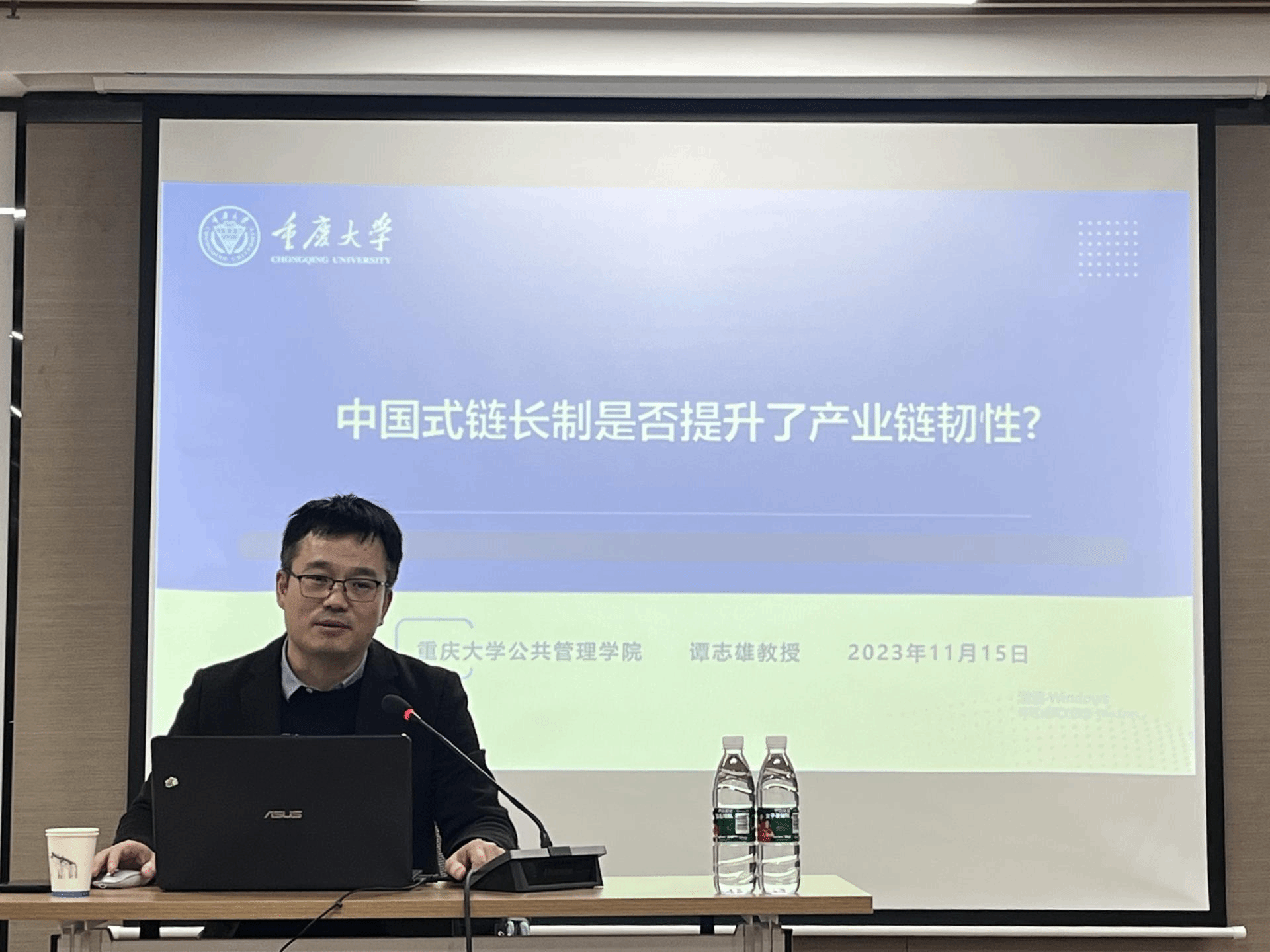 重庆大学公共管理学院谭志雄教授在本次讲座中以“中国式链长制是否提升了产业链韧性”为题,围绕链长制的提出背景、实证检验、推行困境与优化路径做了精彩报告。讲座由西南财经大学经济学院陈姝兴老师主持,三十余名师生积极参与。