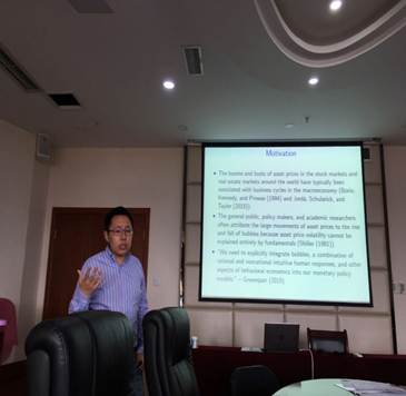 2018年4月16日下午,经济学院学术创新系列讲座第25期在格致楼918会议室成功举行。此次讲座邀请上海交通大学安泰经济与管理学院董丰助理教授作了题为“Asset Bubbles and Monetary Policy”的学术报告。讲座由刘定副教授主持,我院董朝华教授、袁正教授、陈师教授、田超越副教授、余景升和舒海诚老师和大概20余名学生参与了此次讲座。