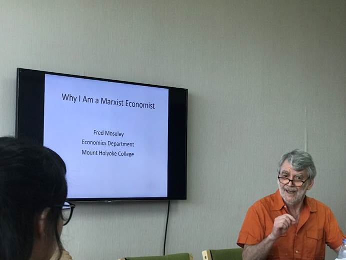 2018年5月16日上午,经济学院学术创新系列讲座第35期在格致楼10楼1014会议室成功举行。此次讲座邀请美国曼荷莲女子学院(Mount Holyoke College)弗莱德·莫斯利(Fred Baker Moseley)教授作了题为“我为何成为一个马克思主义经济学家—一个关于马克思主义理论和新古典经济学理论的比较”的学术报告。讲座由西南财经大学中特中心、经济学院、科研处主办,由经济学院政治经济研究所副所长韩文龙副教授主持,我院杨慧玲教授、李梦凡老师和部分博士生、硕士生参与了此次讲座。